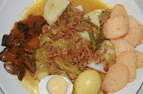 Pelengkap: ketupat, bawang goreng, dan kerupuk
