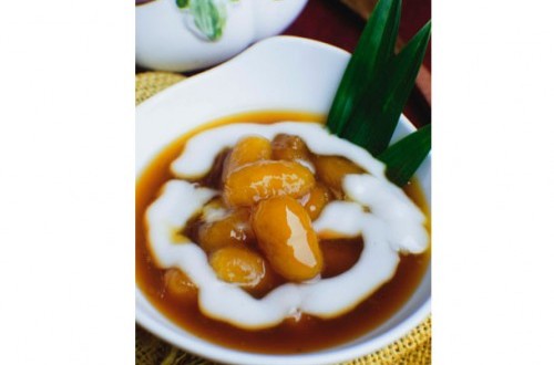 Siapkan wadah taruh kolak biji salak dan tuang saus putih bisa disajikan hangat atau dingin dengan menambahkan es batu.