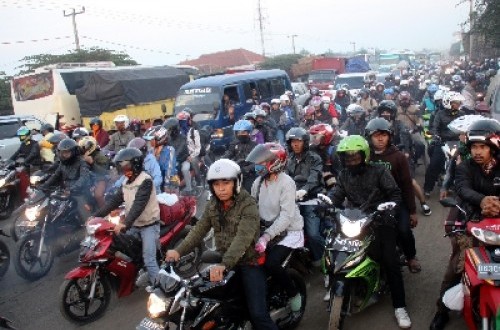 REPUBLIKA.CO.ID, NAGREK -- Pemudik yang menggunakan roda dua dari Jakarta tujuan Garut mulai melintasi jalur mudik Nagreg Kabupaten Bandung, Ahad (20/7). Iring-iringan pemudik roda dua mulai nampak di persimpangan Cileunyi, mereka sempat tersendat di Rancaekek akibat kegiatan pasar dadakan di depan PT Kahatek, selain itu volume kendaraan menuju Nagreg padat.