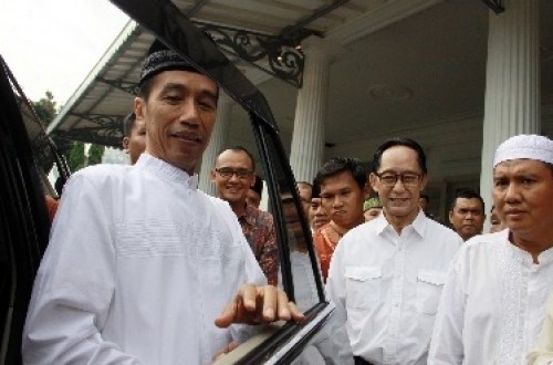 REPUBLIKA.CO.ID, JAKARTA -- Usai menggelar open house di Balai Kota dan mengunjungi kediaman Megawati Soekarno Putri, Presiden Terpilih Joko Widodo kembali melakukan halal bihalal keliling. Kali ini, Jokowi beserta Jusuf Kalla bersilaturahmi dengan Presiden Susilo Bambang Yudhoyono di Istana Negara, Jakarta, Senin (28/7). Keduanya tiba di Istana Negara sekitar pukul 12.25 WIB didampingi istri masing-masing, Iriana Widodo dan Mufidah Jusuf Kala.