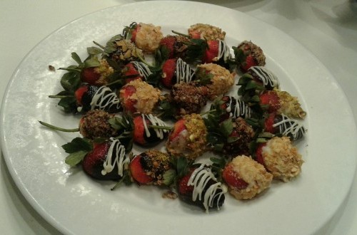 Stroberi yang dibalut cokelat dan ditaburi kacang ini adalah kreasi pastry chef Adinda Triandhina. Lulusan sekolah kuliner Le Cordin Bleu Sydney ini mengatakan tips membuatnya adalah memastikan stroberi dicuci bersih dan dilap dengan handuk dapur hingga kering.