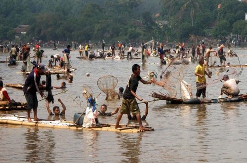 "Sebanyak satu ton ikan dari berbagai jenis di tebar di Situ Gede, warga beramai-ramai menangkap ikan tersebut dengan beragam cara, dengan jala atau ember," katanya seperti dikutip dari Antara.