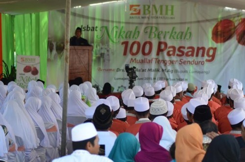 REPUBLIKA.CO.ID, LUMAJANG -- Baitul Maal Hidayatullah (BMH) menikahkan 100 mualaf Tengger. Program nikah berkah ini merupakan permintaan dari masyarakat setempat yang telah lama mendapatkan dakwah dari dai-dai BMH. Direktur Eksekutif BMH, Wahyu Rahman mengatakan berkat kepercayaan umat khsusunya para donatur, kata dia BMH menginisiasi dan istiqomah dalam program-program dakwah. Salah satunya di Senduro Lumajang.