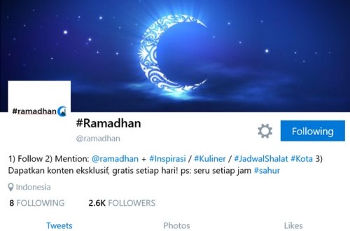 REPUBLIKA.CO.ID, JAKARTA -- Platform komunikasi berbasis real time Twitter menghadirkan akun @ramadhan. Tujuannya memudahkan masyarakat Indonesia mendapatkan konten berkualitas yang relevan dengan yang mereka inginkan selama bulan Ramadhan.