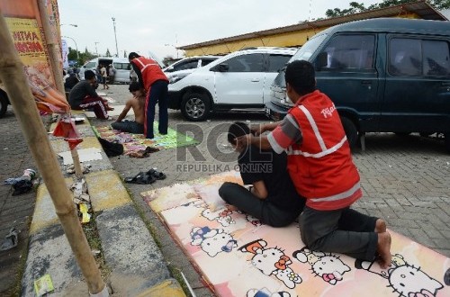 Sejumlah pemudik menggunakan jasa tukang pijat di Rest Area 226 Jalan Tol Palikanci, Jawa Barat, Ahad (12/7). (Republika/Raisan Al Farisi)