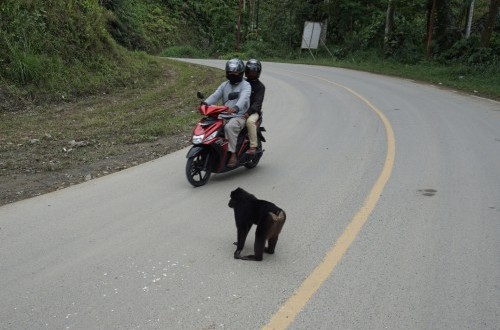 REPUBLIKA.CO.ID, PARIGI MOUTONG -- Seorang pengendara sepeda motor berusaha menghindari seekor Kera hitam Sulawesi (Macaca tonkeana) yang berada di tengah jalan pada jalur mudik poros Tawaeli-Toboli di Kawasan Pegunungan Kebun Kopi, Parigi Moutong, Sulawesi Tengah, Kamis (30/5/2019).