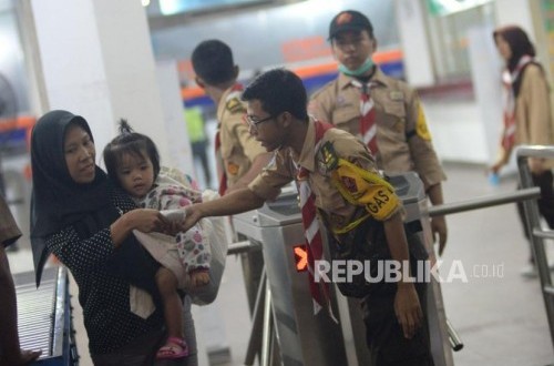 REPUBLIKA.CO.ID, CILEGON -- Ida Safitri (19 tahun), seorang pramuka saka bhayangkara, baru saja selesai menolong seorang pemudik yang lanjut usia (lansia). Dia membantu mengangkat barang bawaan pemudik tersebut dari pintu masuk dermaga menuju tangga yang mengarah ke jembatan dermaga Pelabuhan Merak, Kota Cilegon, Banten.