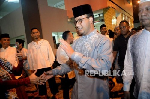 Usai shalat Id, Anies didampingi istri dan Sekda Provinsi DKI Jakarta Saefullah bersalaman dengan jamaah shalat Idul Fitri.