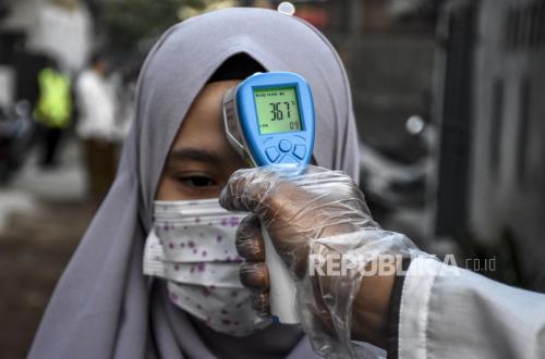 REPUBLIKA.CO.ID, BANDUNG -- Petugas mengecek suhu tubuh warga yang hendak menunaikan Shalat Idul Fitri di area dekat Stasiun Cimekar, Desa Cibiru Hilir, Kecamatan Cileunyi, Kabupaten Bandung, Jawa Barat, Ahad (24/5). Petugas Palang Merah Indonesia yang berdomisili di kawasan tersebut, Usep Diman, mengatakan pengecekan suhu tubuh merupakan bagian dari upaya penerapan protokol kesehatan untuk mencegah penularan Covis-19 dalam pelaksanaan Shalat Idul Fitri.