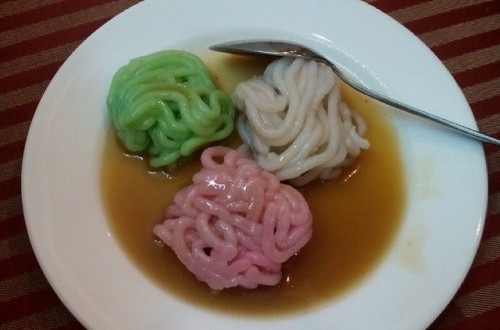 5. Ambil satu bagian warna, masukkan ke dalam cetakan putu mayang, cetak di atas daun yang sudah diolesi minyak. Lakukan untuk semua bahan.
