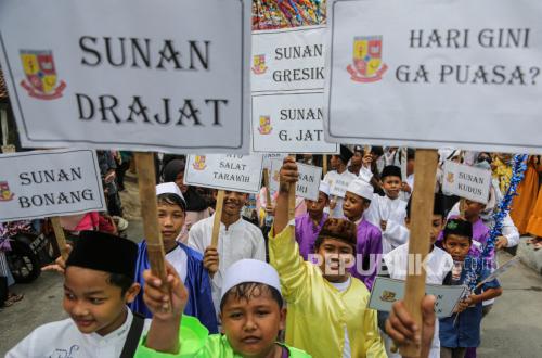 REPUBLIKA.CO.ID, GENUK. -- Sejumlah anak berjalan sambil membawa poster saat mengikuti pawai kirab budaya di kawasan Genuk, Semarang, Jawa Tengah, Jumat (8/3/2024).