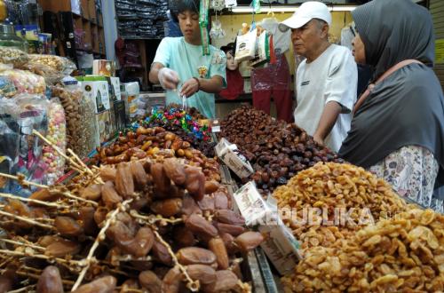 REPUBLIKA.CO.ID, BANDUNG -- Pedagang kurma melayani pembeli di Pasar Baru, Kota Bandung, Jawa Barat, Senin (18/3/2024).