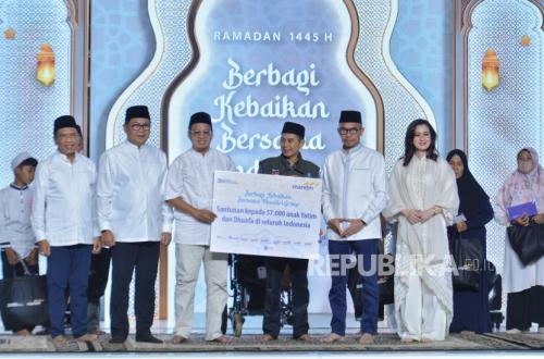 REPUBLIKA.CO.ID, JAKARTA -- Wakil Komisaris Utama Bank Mandiri Zainudin Amali, Direktur Utama Bank Mandiri Darmawan Junaidi, Komisaris Utama Bank Mandiri Chatib Basri, dan Wakil Direktur Utama Bank Mandiri Alexandra Askandar menyerahkan santunan ramadan dari Mandiri Group kepada perwakilan yayasan, anak yatim piatu dan duafa di Nawasena Campus Mandiri University, Jakarta, Kamis (28/3/2024).
